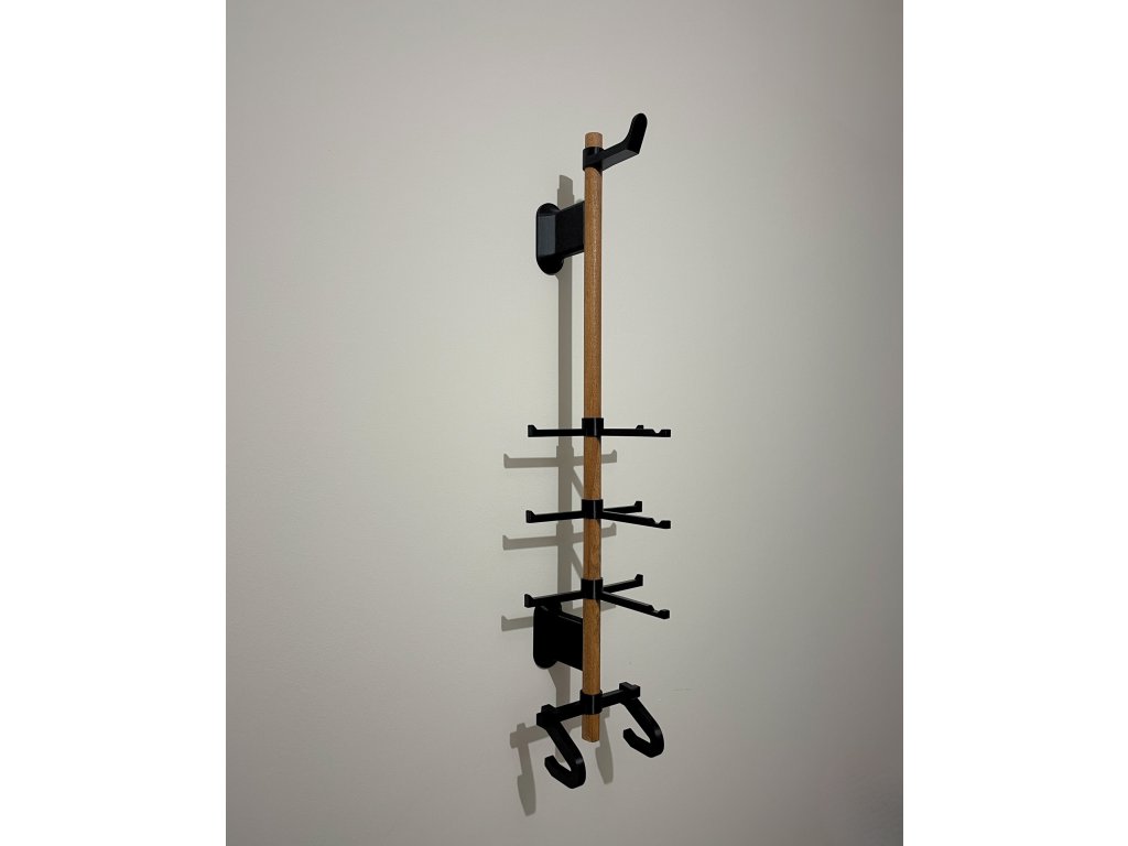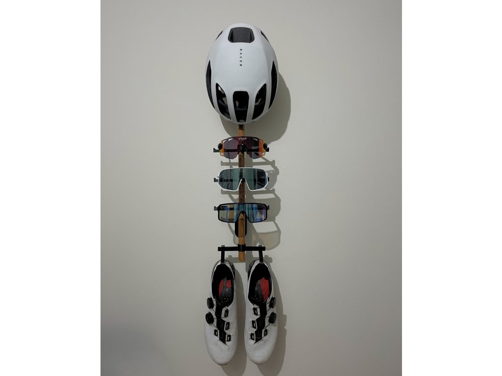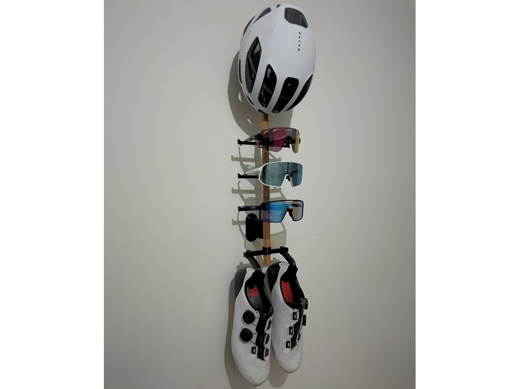 Elegantní a praktický věšák na cyklistické vybavení nabízí přehledné uspořádání helmy, brýlí, obuvi i drobných doplňků na jednom místě.